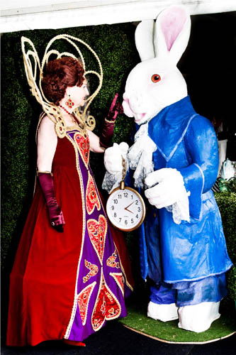 On arrival, guests were welcomed by lovely looking ‘Alices’ and enjoyed canapés and pre luncheon cocktails in the magical mad hatters themed marquee complete with magic mushrooms, giant teacups and a smiling 2 metre high white rabbit in a waist coat and giant watch.