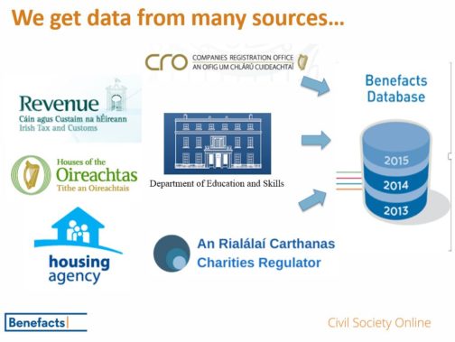 The contents are drawn from nine regulatory sources including filings by nonprofit companies with the Companies Registration Office. The public are not the only users of the database: Benefacts makes data available in customized formats to a range of other end-users, in the nonprofit sector itself, and among its funders and donors including government. Social entrepreneurs, analysts and researchers also benefit from access to a database which is maintained up-to-date and which, over time, will become the authoritative source of trusted, impartial information about the entire population of nonprofits operating in Ireland.